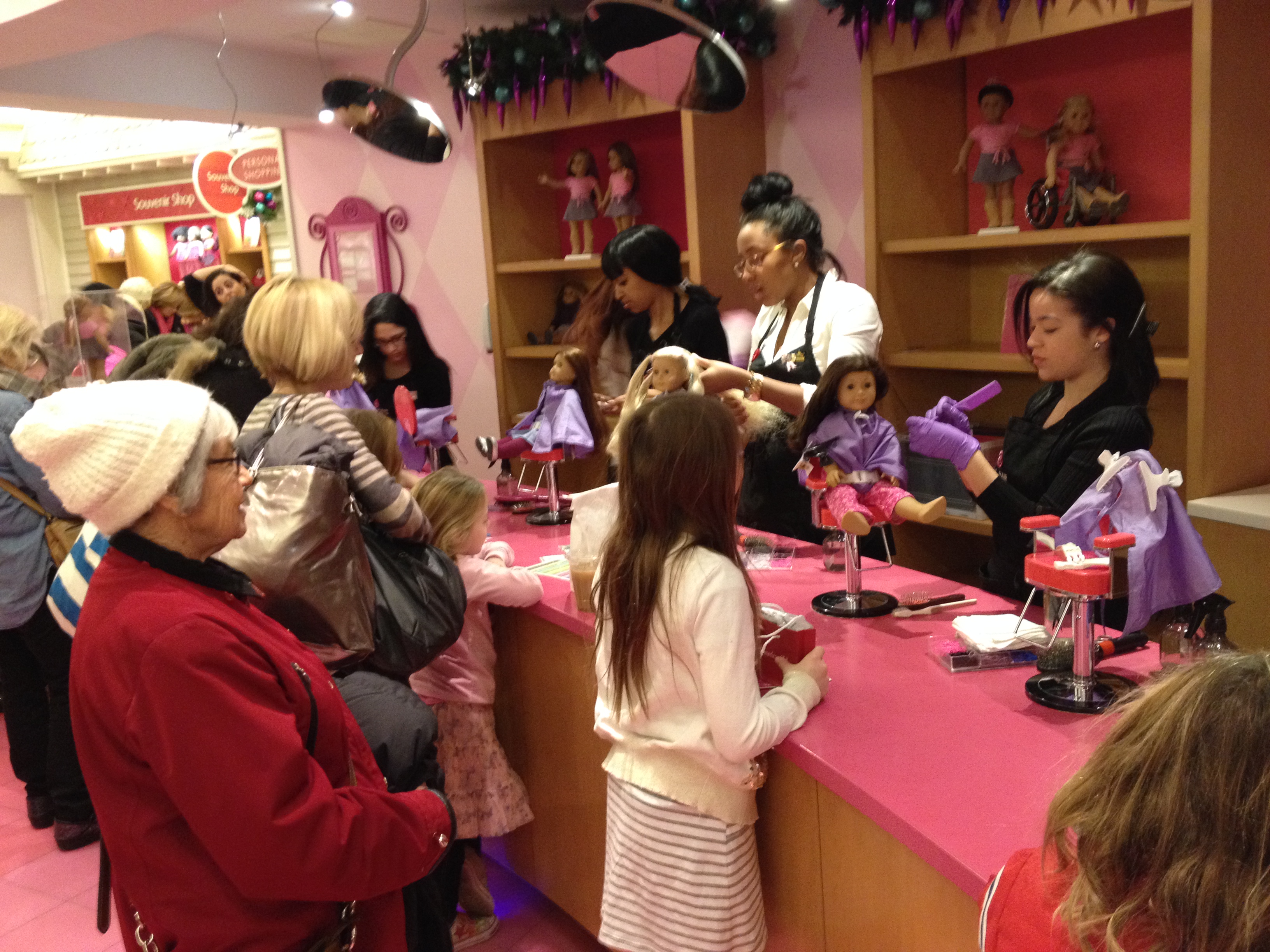 So, when I took my daughter and mother-in-law to the American Girl Doll flagship store in New York City, three full floors of what I can only describe as a doll-museum-meets-Macy’s-on-meds, I thought I’d died and went to doll heaven. Or doll purgatory, given some of the crazy females that surrounded us with spray-on tans, luggage-size European handbags and diamond rings that could give you a black eye if you stood too close. I didn’t know what to think, but I have to say, my daughter was excited. So we were too.